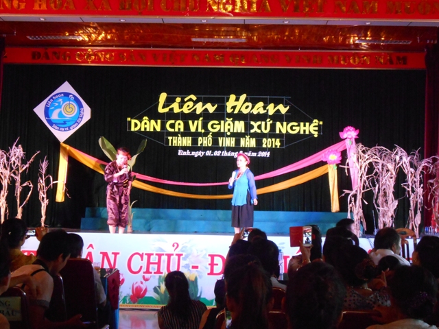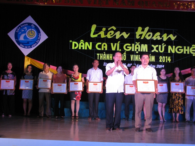 (VHNA): Sau 2 ngày (1-2/8/2014) diễn ra với gần 1000 diễn viên, nghệ nhân không chuyên đến từ 22 đơn vị, Liên hoan Dân ca Ví, Giặm xứ Nghệ thành phố Vinh năm 2014 đã kết thúc tốt đẹp. Kết quả, BTC đã trao giải Nhất cho phường Trung Đô; đồng giải Nhì: phường Vinh Tân và Hà Huy Tập; giải Ba: phường Lê Mao, Quán Bàu và Hưng Phúc; đồng thời trao 9 giải Khuyến khích, 15 giải tiết mục B và 10 giải tiết mục A.