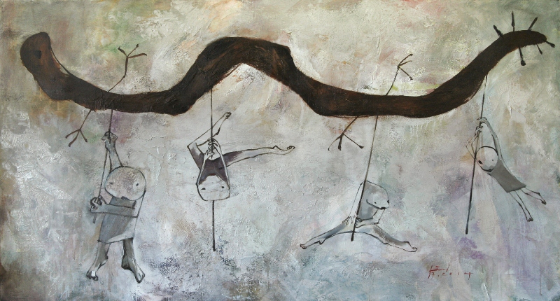 2.Tôi bị mê hoặc bởi hình tượng thế giới và góc nhìn đời sống thể hiện qua cấu tứ của tranh Doãn Hoàng Lâm. Tôi nghĩ, tuy không bất lực trong việc biểu hiện thời gian, nhưng hội hoạ trước hết là nghệ thuật không gian. Không gian nghệ thuật ở tranh Doãn Hoàng Lâm được giới hạn trong phạm vi của những khung cảnh sinh hoạt với nhiều mô típ hành động có thể chuyển thành truyện kể. Ở đây, hoàn toàn không có chi tiết nào gợi ra ý niệm về không gian con đường, quảng trường, hay không gian nội thất mà ta vẫn thường gặp ở những tác phẩm hội hoạ vẽ cảnh sinh hoạt. Với Doãn Hoàng Lâm, ngay cả cảnh “mây mưa” hình như cũng không phải là sinh hoạt “phòng the”. Mọi chi tiết được vẽ trong sáng tác của anh đều khắc hoạ một hình tượng không gian vũ trụ.