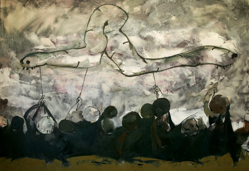 3.Ra khỏi phòng tranh của Doãn Hoàng Lâm, từ hình tượng về một thế giới bi hài trong sáng tác của anh, tôi không thể không liên tưởng tới loạt tác phẩm triết học bàn về “sự ngu” và “cái ngu” của “tấn hài đời” của các triết gia thời Phục Hưng: Sebastian Brant (1427 – 1521), Érasme de Rotterdam (1469 – 1536), Michel Euquem de Montaigne (1533 – 1592), Francis Bacon (1561 – 1626). Tôi nhớ tới kịch Hamlet củaShakespeare với hình ảnh của những Claudius tráo trở, Osric tầm thường, giả dối, những Polonius, Laertes suốt đời chạy theo “tấm áo thụng cuộc đời”, ở phía này, và bên kia, hình ảnh Hamlet mân mê trên tay những chiếc sọ dừa ngoài nghĩa địa để triết lí về sự hư vô của cuộc đời. Tôi nghĩ tới vở kịch Thây sống của L. Tolstoi, tới ông lão trong sáng tác của Hemingway hì hục suốt mấy ngày đêm giữa biển cả để chỉ kéo về bộ xương con cá kiếm. Tôi nghĩ tới không gian tâm linh bị không gian sinh hoạt thường nhật xoá bỏ, tới lớp lớp xác phù du trên các bãi sông, tới lăng mộ các triều đại đã qua trong sáng tác của Nguyễn Huy Thiệp.