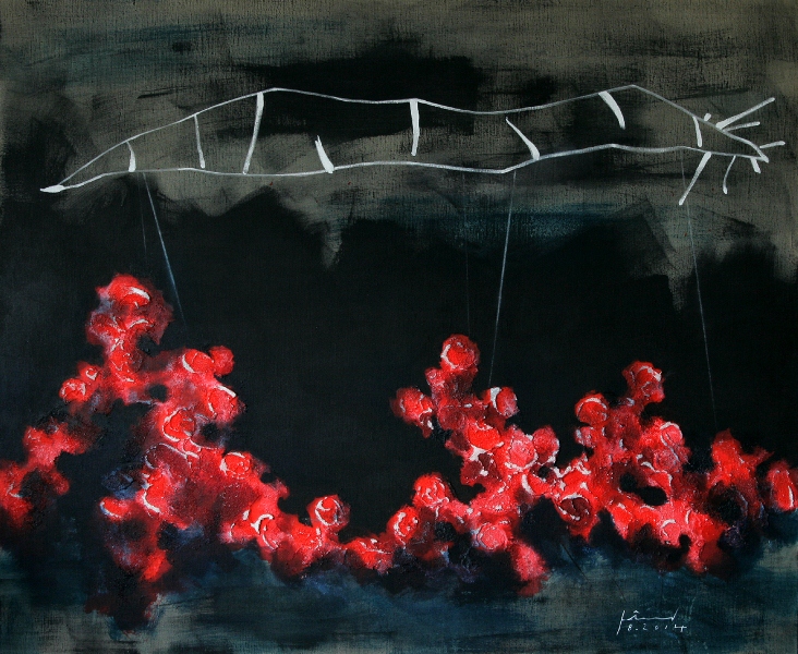 Xem tranh cổ điển, tôi thấy, là một cấu trúc biểu nghĩa, vũ trụ thường được kiến tạo theo trục các đường chéo hình chữ nhật. Nhờ thế, trong trí tưởng tượng của người xem, hình tượng không gian tựa như được dâng cao, trải dài vô tận, vượt ra bên ngoài giới hạn của khung tranh. Trong các bức tranh của Doãn Hoàng Lâm, hình tượng vũ trụ được kiến tạo theo trục của các cạnh dài và cạnh ngắn hình chữ nhật làm thành các cạnh của khung tranh. Ở đây, khung tranh hoá thành khung vũ trụ, trùng khuýp với vũ trụ. Vũ trụ ấy mở ra ở hai chiều cao - thấp, xoá bỏ ấn tượng về khoảng cách gần – xa. Đó là vũ trụ của giá trị luận, chứ không phải vũ trụ của phản ánh luận. Đặt những cái “xác phàm” và con người vào không gian này, Doãn Hoàng Lâm thể hiện một cái nhìn đầy hài hước về sự đảo lộn các giá trị đời sống. Sự đảo lộn các giá trị thể hiện ở tương quan vị thế giữa “NGƯỜI” và “XÁC”. Trong một số bức tranh của Doãn Hoàng Lâm, người bị lột trần, hoặc để lộ hoàn toàn phần “xác” ra bên ngoài giống như những con vật; “xác” bành trướng, lấp đầy không gian của cảnh tranh. Ở nhiều bức khác, “Xác” ở bên trên. Nó được phóng đại, cá thể hoá, được đồng nhất với một thứ quái thú, lúc giống như giun, như rắn, như rồng, lúc tựa như sâu bọ lông lá gớm ghiếc, nằm vắt ngang theo chiều dài hình chữ nhật khung tranh, che lấp vũ trụ ở bên trên. Ta hiểu vì sao, tranh của Doãn Hoàng Lâm không thiếu màu sắc, nhưng rất ít ánh sáng, một số cảnh tranh chìm hẳn trong bóng tối. Người ở bên dưới, không được cá thể hoá và bị thu nhỏ kích thước. Do bị che lấp vũ trụ bên trên, con người chen chúc trong một thứ không gian tựa như “hoả ngục”. Nó bất thành nhân dạng, chỗ túm năm tụm ba, nơi kết thành “đoàn”, thành “đám”, như một lũ đầu trâu mặt ngựa. Các mô tip hành động trong tranh Doãn Hoàng Lâm cho phép ta hình dung những câu chuyện diễn ra giữa “XÁC” và “NGƯỜI”. Ở một bức tranh có câu chuyện về cái xác tả tơi, tựa như vừa bị xâu xé bởi hàng chục cái miệng vẫn còn mở rộng, răng nhọn hoắt, trắng xoá. Ở một số bức khác, lại có câu chuyện về người “kéo xác”, “lôi xác”, “đánh đu với xác”, “giành giật nhau cái “XÁC”. Nhìn vào động tác “đánh đu”, “lôi”, “kéo”, “giành giật”, ta thấy một đám người, ai cũng “gắng gỏi”, đầy “ham hố”. Nhưng thú nhất có lẽ vẫn là cảnh “RƯỚC XÁC” giống như những đám rước dân gian.