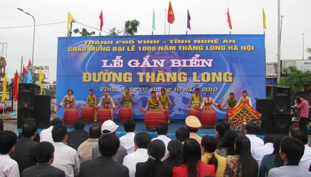 (VHNA): Buổi lễ đã lọng trọng diễn ra sáng nay, ngày 7/10/2010, tại thành phố Vinh do UBND thành phố Vinh tổ chức (theo Quyết định 4355/QĐ – UB ngày 24/9/2010 của UBND tỉnh Nghệ An về việc đặt tên đường Thăng Long). Đoạn đường này được bắt đầu từ ngã tư Quán Bánh đến hết địa bàn xã Nghi Liên (thành phố Vinh). Đây là con đường lớn ở cửa ngõ phía Bắc thành phố Vinh hướng về Thăng Long - Hà Nội, chiều dài 5.500m, rộng 46,5m đang được khẩn trương quy hoạch mở rộng, nâng cấp. Đây là con đường hiện đại trên huyết mạch Bắc – Nam. Đây là một trong những công trình của Nghệ An chào mừng kỉ niệm 1.000 năm Thăng Long - Hà Nội.