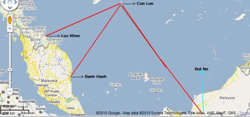 -Lại từ núi Côn Lôn theo hướng Khôn Mùi [217.5 độ] thời gian 30 canh đến Ðấu Dự, lại theo hướng Ðinh Ngọ [187.5 độ] đến nước Bành Hanh [tức Pahang thuộc Mã Lai](11)