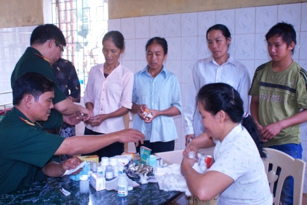 (VHNA): Để giúp đỡ đồng bào Hà Tĩnh vừa bị lũ dữ, ngày 12/10, QK 4 đã cử một đoàn bác sỹ quân y gồm 7 người, mang theo 02 cơ số thuốc và một số hoá chất cloramin lên công tác tại xã Phương Mỹ huyện Hương Khê, Hà Tĩnh, nơi bị ngập sâu nhất trong cơn lũ vừa qua. Đoàn bác sỹ QK 4 đã phối hợp Bênh viện huyện Hương Khê, Trạm y tế xã Phương Mỹ tổ chức khám bệnh và cấp thuốc miễn phí cho hàng trăm người dân, hướng dẫn nhân dân giữ vệ sinh bảo vệ sức khoẻ.