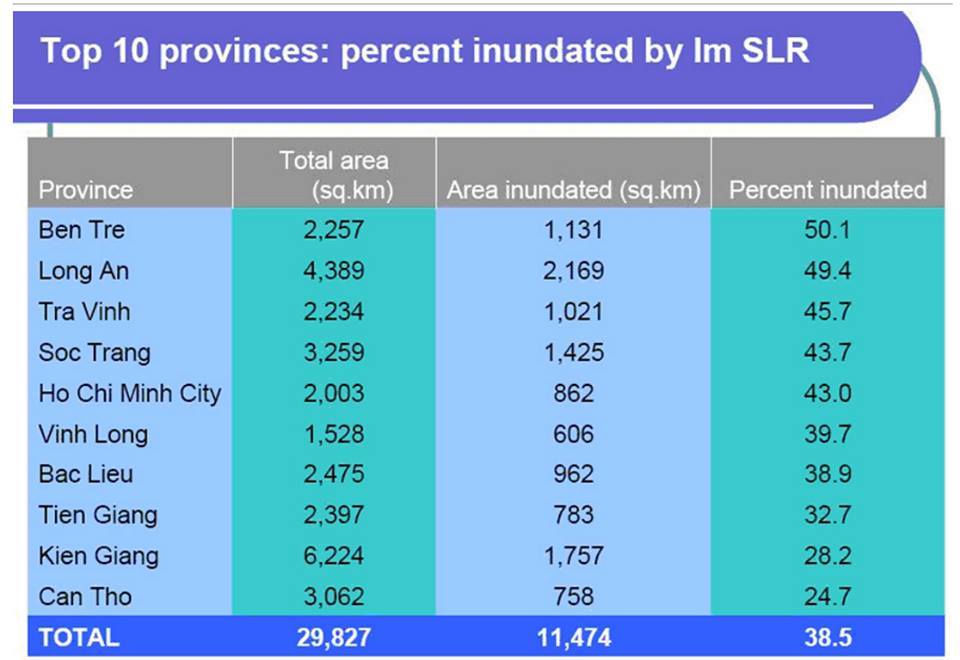 Dựtính sẽcó tới 10 tỉnh ởViệt Nam sẽchịu ảnh hưởng nặng do tác động chung của vấn đề, tương đương với 29.827 km2 (lưu ý rằng diện tích này gần xấp xỉ10% diện tích lãnh thổtoàn Việt Nam), trong đó 38% diện tích đất sẽbịngập hoàn toàn. Mức tác động do đó vô cùng lớn. Và đểthích ứng với tình hình, cần có những chiến lược quy hoạch vùng đồng bằng sông Cửu Long hoàn toàn khác.