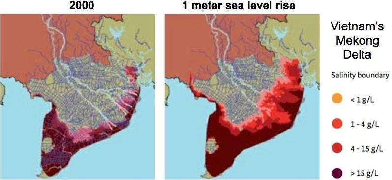 Với những lo ngại rất có lý vềan ninh lương thực và vềgiống loại thủy sản nuôi trồng phù hợp khi độmặn tăng cao. Những băn khoăn này là một bổsung tốt đểxem xét vấn đềkỹcàng hơn. Hãy xem bản đồdưới đây vềcác vùng bịxâm nhập mặn và sẽbịngập nước mặn: