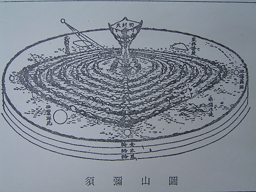 [72]“Mô hình vũ trụ với tâm điểm là núi như là trục thế giới (axis mundi) được giả thuyết là chịu ảnh hưởng từ mẫu kiến trúc tối cổ, những ziggurat từ văn minh Lưỡng Hà, dựng bởi người Sumer, Babylon, Elamite, Akkadia, Asyria, khởi đầu có thể từ thời Ubaid, tiền văn minh Lưỡng Hà, khoảng 6500-3800 tr.TL. Những ziggurat được xem như những kim tự tháp có chóp bằng, nhiều tầng, phổ thông là 7 tầng. Nổi tiếng vĩ đại là ziggurat Ur ở Nasiriya, nay là tỉnh Dhi Qar thuộc Iraq. Chúng chỉ có thể đối chiếu với Tu-di về mặt tượng trưng; về mặt hình thức, không hoàn toàn giống nhau.