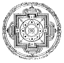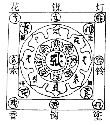 Mandala là tiếng Phạn, Hán ngữ phiên âm là Mạn đồ la (漫荼羅), Mạn đà la (曼陀羅, 蔓陀羅), Mạn tra la (曼吒羅), Mạn Noa La (曼拏羅), Mãn đồ la (满荼邏), Mãn noa la (满拏囉) và dịch nghĩa là đàn, Phật đàn, đàn tràng, đàn thành, đạo tràng, tụ tập, luân viên cụ túc[40]. Từ điển Phật học Huệ Quang ghi: “đàn tràng: nơi đệ tử Phật giảng pháp hoặc nơi hành giả Mật giáo tác pháp tu hành”[41]. “Đàn: đài bằng đất hoặc gỗ để tôn trí tượng Phật, Bồ Tát, hình Tam muội da và vật cúng trong phép tu của Mật giáo”[42]. Trên thực tế, mandala là một dạng kiến trúc ba chiều kết hợp hình tròn- hình vuông[43] dùng để thực hiện các phép tu tập hay nghi lễ của Mật giáo. Nguyên thủy trong văn hóa Ấn Độ, mandala vốn được đắp bằng đất, trên đó tôn trí tượng Phật và Bồ Tát, tu pháp làm lễ xong thì phá bỏ. Mandala thường được kết hợp rất đa dạng giữa hai hình cơ bản là tròn và vuông, bởi theo quan niệm “thiên viên địa phương” (trời tròn đất vuông) của Mật giáo (xem hình minh họa). Hiểu một cách đơn giản nhất, mandala là cái đàn tế mà thôi. Cũng cần nhấn mạnh lại một điểm là đàn tràng có tính tượng trưng cho sự hình tượng hóa, thần thánh hóa, nó đại biểu cho một tiểu vũ trụ; nó là một “công cụ vu thuật”[44].