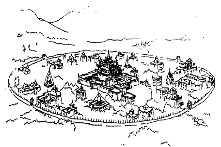 Hình: kiến trúc chùa Tang Da (桑耶寺)[50] theo đồ hình mandala có bốn cửa bốn lối thông vào trung tâm kiến trúc, thế kỷ VIII-IX (nguồn: “Trát Nang huyện văn vật chí”)[51].