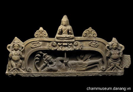 Hình 3: Thần Vishnu nằm trên rắn thần Ananta, lanh-tô tháp Mỹ Sơn E1 (tỉnh Quảng Nam), thế kỷ thứ VII, đá, dài 240 cm. Nguồn: Bảo tàng Chăm, Đà Nẵng.