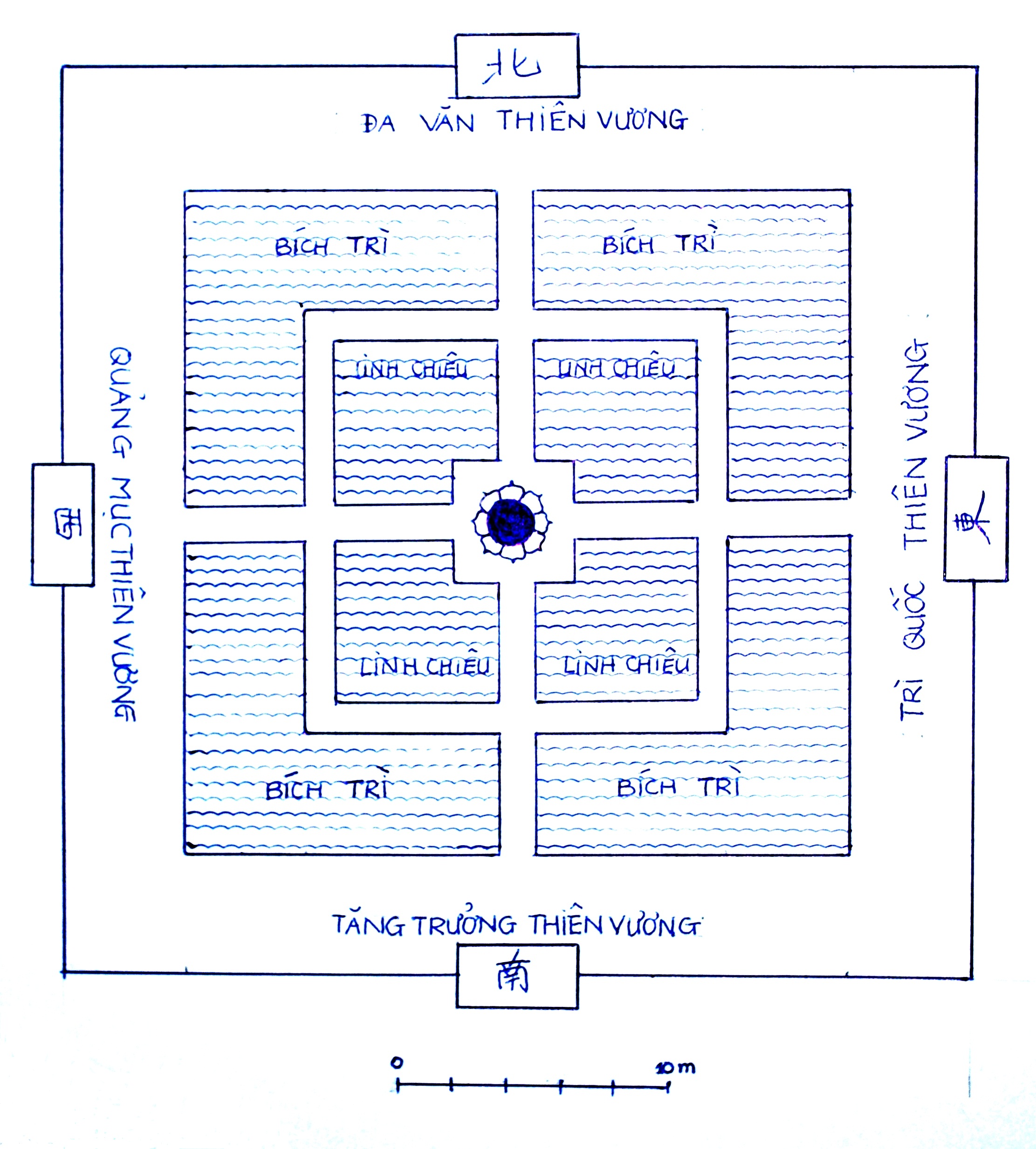 Ngoài hành lang khép kín chung quanh ao Linh Chiêu sẽ là Bích Trì. Bích Trì có khả năng sẽ là một ao vuông như lời thơ mà Trúc Lâm tam tổ Huyền Quang đã miêu tả “xi vẫn đảo miên phương kính lãnh” (hình xi vẫn ngủ ngược trên mặt gương vuông lạnh lẽo)[38], ao này sẽ đồng tâm với tất cả đồ hình vừa nêu trên. Đúng như Ngô Văn Doanh và Nguyễn Duy Hinh đã nhận xét kiến trúc đang xét vào thời Lý là “một quần thể kiến trúc có bình đồ hướng tâm, từ ngoài vào trong” (xem bình đồ của các tác giả tại phần phụ lục)[39]. Kiến trúc mặt bằng đồng tâm- đa tầng như vậy khiến chúng tôi đoán định rằng, đây chính là một dạng đàn tràng có đồ hình mandala vào thời Lý (xem hình trên). Để hiểu rõ hơn về nhận định trên đây, chúng tôi xin giới thiệu qua về đàn tràng (mandala) và đồ hình mandala trong văn hóa Đông Á và Việt Nam.