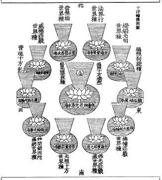 Với những mô tả như trên, núi Tu Di trong kinh sách Phật giáo được mường tượng như là một đài sen nhô lên từ mặt nước (nhất hoa nhất thế giới). TheoHoa Nghiêm kinh (Avatamsaka-Sutra), đây là pháp hội của thế tạng hay cõi nước Tịnh Độ của Phật Tỳ Nô Xà La- chân thân của đức Thích Ca Như Lai. Kinh nàycũng nói hoa sen lớn sinh ra từ hương thủy hải, trong hoa sen ấy lại hàm chứa các thế giới nhiều như vô số vi trần, cho nên gọi là Hoa Tạng Thế Giới Hải. Tầng dưới cùng là phong luân, trên phong luân có biển Hương Thủy Hải, trên Hương Thủy Hải trồi ra đóa sen lớn ngàn cánh, trong đóa sen lớn chứa vô số những thế giới khác nhau nhỏ tựa bụi trần (vi trần), vì thế được định danh bằng tên Hoa Tạng Thế Giới hay Liên Hoa Tạng Thế Giới[20]. Các Đức Phật chứng được Vô Thượng Chính Đẳng Chính Giác, dùng tịnh thức chuyển biến ra các thế giới, vì thế cho nên gọi là thế giới chư Phật. Tiếng Phạn là ksetra, nghĩa là cõi hay cõi nước. Hoa sen lớn là thí dụ chân như pháp giới. Hoa sen lớn có đài nghìn cánh hoa, mỗi cánh là một thế giới đức phật Lô Xá Na hóa làm 1000 đức Thích Ca ở 1000 thế giới. Mỗi diệp thế giới lại có trăm ức núi Tu Di, và 1000 triệu thế giới, trăm ức cõi Nam Diêm Phù Đề (xemPhạm võng kinh)[21]. Hoa sen mọc trên biển là nơi chư Phật hội tụ được gọi là Liên Trì Hải Hội. Liên Trì Hải Hội tiêu biểu cho sự tập hợp của Phật A Di Đà, chư Bồ tát, các bậc thức giả, Thánh chúng, cùng các thượng thiện nhân đều hội nơi Tây Phương Cực Lạc. Gọi là Liên trì Hải Hội vì số Phật tham dự là vô số, trải dài ra như đại dương trong pháp giới.