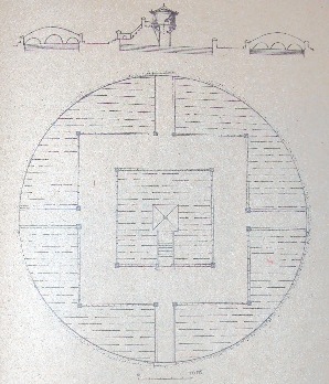Ở đây, ta thấy có đến hai vòng ao bao quanh Thích Ca liên hoa đài. Ao thứ nhất là Linh Chiêu. Ao thứ hai là Bích Trì. Hai ao này được ngăn cách bởi một hành lang khép kín (hoàn lang). Hành lang vẽ có mái đó[72] hẳn là phải được dựng trên một nền mặt đất kè ngăn giữa hai ao, để “cho các sư đi vòng quanh tụng kinh cầu cho vua được trường thọ” (Đại Việt sử ký toàn thư). Hai ao này đồng tâm, và điểm đồng tâm này chính là đài hoa sen- trung tâm của tổng thể kiến trúc. Vậy cầu dẫn từ ngoài vào đến Liên hoa đài được bắc qua hai ao (Linh Chiêu + Bích Trì), vì thế số lượng tối thiểu ở đây phải là hai chiếc cầu (Chúng tôi gọi đây là giả thuyết tối thiểu, xem hình bình đồ). Một chiếc bắc từ bờ Bích Trì vào đến phía ngoài hành lang, và một chiếc từ phía trong hành lang bắc qua ao Linh Chiêu vào đến Liên hoa đài. Bản dịch gần đây của nhóm Nguyễn Văn Thịnh “bắc các cầu làm đường thông”[73] là có cơ sở.