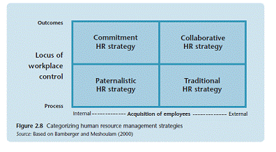 Trong đó, chiến lược quản trị nhân sự “cổ điển” hay “truyền thống” như đã được phân tích ở trên, sử dụng phương thức “cứng”, bỏ qua những khía cạnh về con người, theo đó công tác quản trị nhân sự của tổ chức doanh nghiệp tập trung chủ yếu vào giám sát và kiểm soát người lao động, và “mua lại” (tuyển dụng trực tiếp) từ thị trường lao động hơn là “tạo ra” (đầu tư vào phát triển và đào tạo) nguồn nhân sự của mình (Bratton and Gold 2007) .