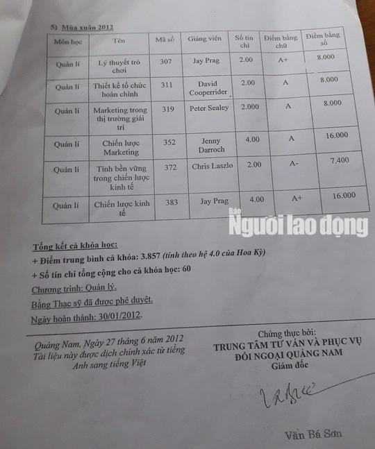 Đề nghị ông LPHB bổ sung điểm của 32 tín chỉ còn lại, hoặc yêu cầu báo NLĐ đưa ra Bảng điểm đầy đủ, ghi cả kết quả học tập của năm 2011.