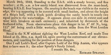 Ngày 29.3.1843, thuyền trưởng người Anh Richard Spratly phát hiện đảo Trường Sa và Đá Lát (Ladd Reef). Phát hiện này công bố trên “Tạp chí Hàng hải” (the Nautical Magazine) trong cùng năm. Bộ Hải quân Anh đồng ý đặt tên cho nhóm đảo là Spratly Islands (quần đảo Trường Sa).[8]