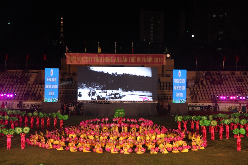 Tối nay, 11/5/2018, lúc 20h, UBND tỉnh Nghệ An đã tổ chức khai mạc Đại hội TDTT toàn tỉnh lần thức VIII. Dự lễ có các vị lãnh đạo tỉnh, các ban/ngành của tỉnh, đại diện Tổng cục TDTT (Bộ VHTTDL), Quân khu IV, các tỉnh Thanh Hóa, Hà Tĩnh và đông đảo các vận động viên của 21huyện, thành, thị. 1000 vận động viên sẽ thi đấu 18 môn thể thao với 338 bộ huy chương. Hiện tại đã hoàn thành thi đấu 12 môn, sau lễ khai mạc thi đấu tiêp 6 môn còn lại. Đại hội sẽ bế mạc vào ngày 15/5/2018