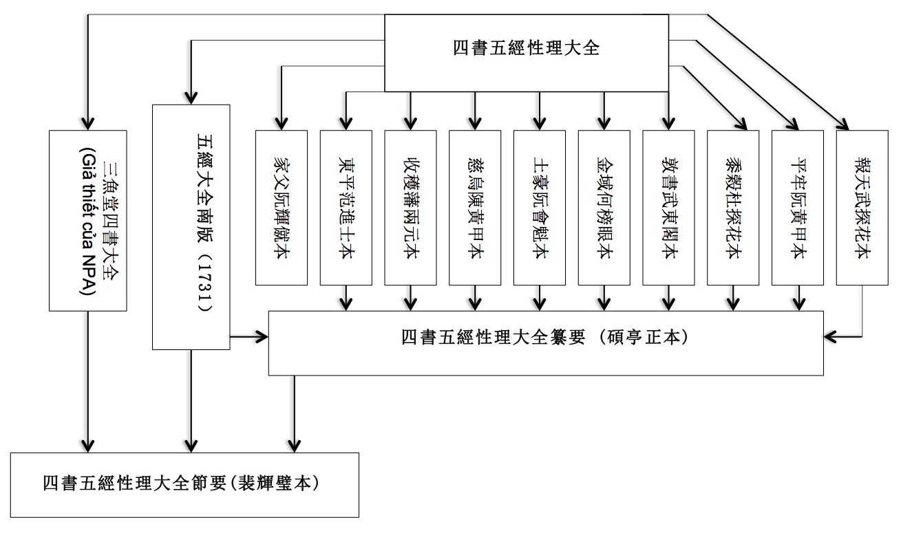 (1) Hệ bảnNgũ kinh Đại toàn được khắc in và ban bố tại Việt Nam vào những năm niên hiệu Vĩnh Khánh (1732-1735) theo chính sách chính thống kinh điển của Trịnh Giang.Hệ bản Ngũ kinh Đại toànnày lấyNgũ kinh Đại toàn《五經大全》(từ đây gọi tắt là bộ Đại toàn大全,do nhóm Hồ Quảng胡廣(1370-1418) biên soạn) làm ‘điểm gốc’ (locus classicus), nhưng đã có sự hiệu duyệt của từ các nhà Nho Việt Nam thế kỷ XVIII. Hệ bản này chúng tôi tạm gọi là Ngũ kinh Đại toàn Nam bản 五經大全南版[63].