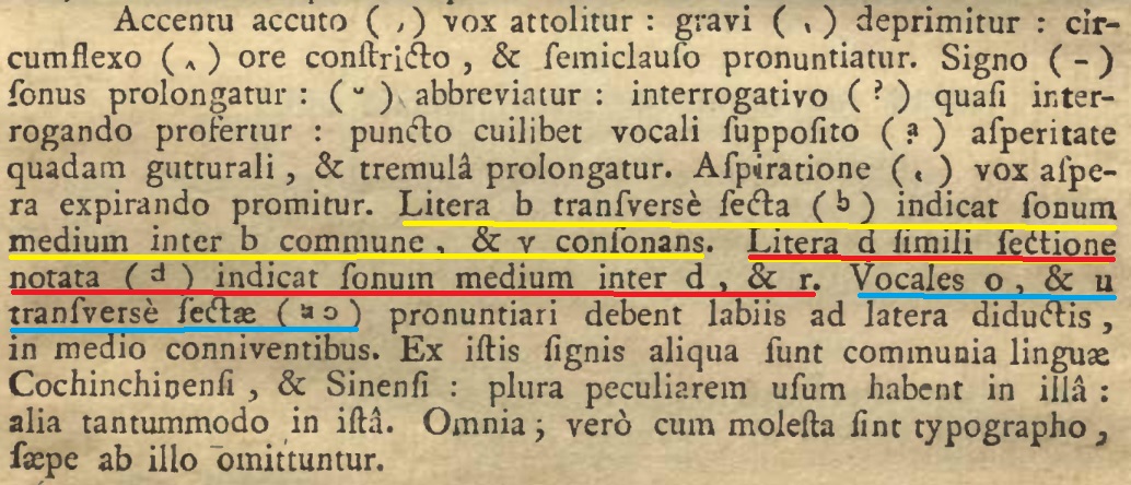 -Nét vòng xuống ở phần dưới của chữ cái dùng để ghi một âm xát, môi-răng giữa /b/ và /v/ (tức âm /ꞗ/) trong VBL được thay bằng chỗ hở ở nửa dưới của chữ thường và ở giữa nét thẳng của chữ hoa/in.Ví dụ: “ꞗòi ꞗoi” (tức “vòi voi”) được viết là “bòi boi” trong các tên: “bòi boi cỏ” (tr.103), “bòi boi deei” (tr.116), “nấm cứt boi” (tr.696) và “mía boi” (tr.52)