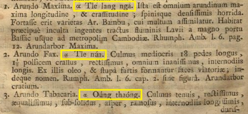 Tuy nhiên, trong cuốn sách vẫn còn khá nhiều tên có sự phân loại chồng chéo, nhiều tên Latin chưa được công nhận và có những tên Latin thiếu tên Việt, như Merrill đã chỉ ra trong bài viết của ông (Merrill. 1933). Về điểm này, chúng tôi cũng nhận thấy một trường hợp khá rõ là tác giả đã xếp các từ: Tle nua, Tle lang nga, Tle Oúng thaóng vào tiểu loại của mục từ Cây hóp (Arundo Muntiplex) và không có từ Nua (nứa) riêng.