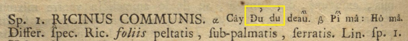 - Trong TVĐT còn có một số tên được ghi với chữ kép . Ví dụ: Cây dea (cây da), Cây deẻ (cây dẻ), Cây déo bầu(Cây dó bầu). Đây là cách ghi phụ âm /dj/ được de Rhodes dùng chữ kép trong từ điểnVBL, ví dụ: dĕài (dài), cây dĕa (cây da), dĕạy (dạy). Hình thức này không còn được sử dụng trong từ điển VL. Ví dụ dưới đây là cây deó bầu (tr.267)