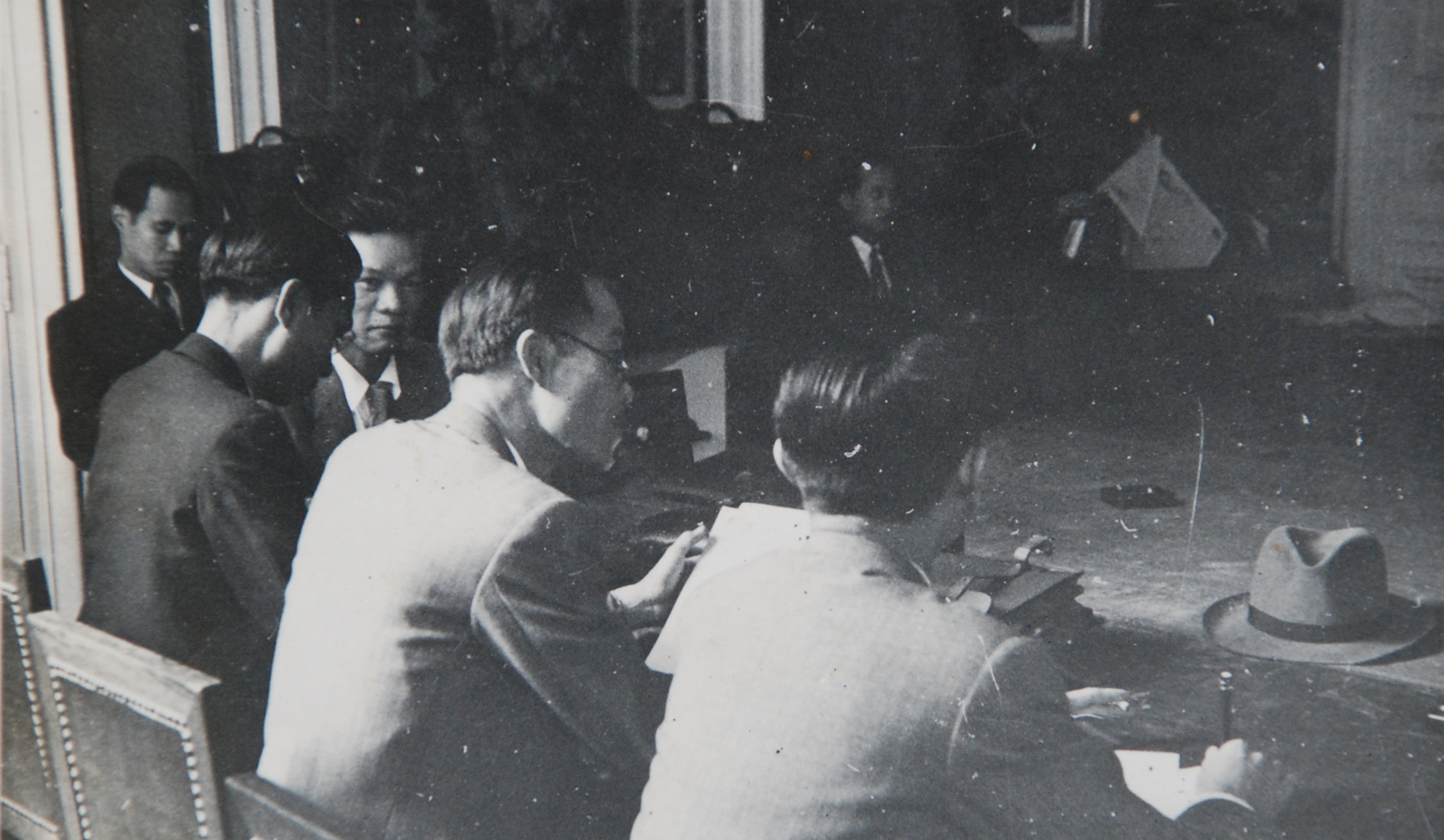 Nguyễn Văn Huyên (người ngồi đầu tiên, bên trái) tại phòng họp của phái đoàn Việt Nam ở Fontainebleau. (Tư liệu KMS)