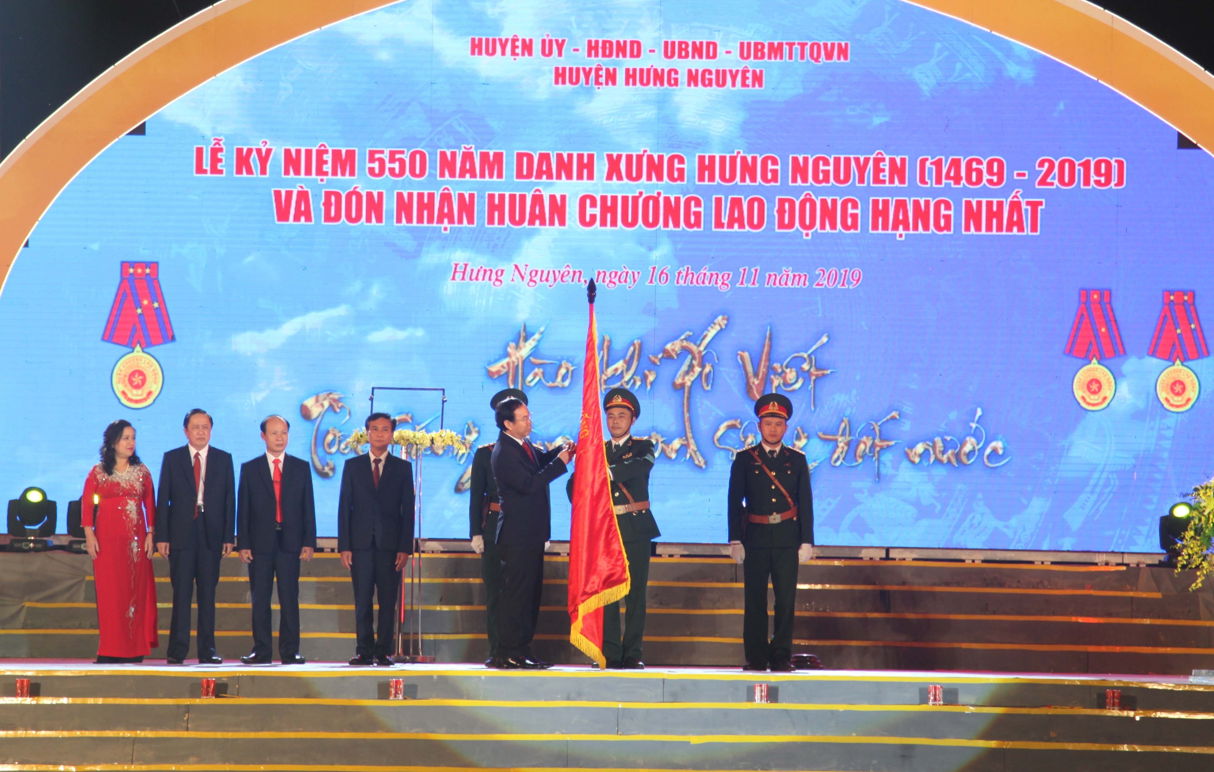 Tại buổi lễ, thừa ủy quyền Chủ tịch nước, ông Nguyễn Văn Nên - Bí thư Trung ương Đảng, Chánh Văn phòng Trung ương đã trao tặng Huân chương Lao động hạng Nhất cho Đảng bộ và nhân dân huyện Hưng Nguyên.