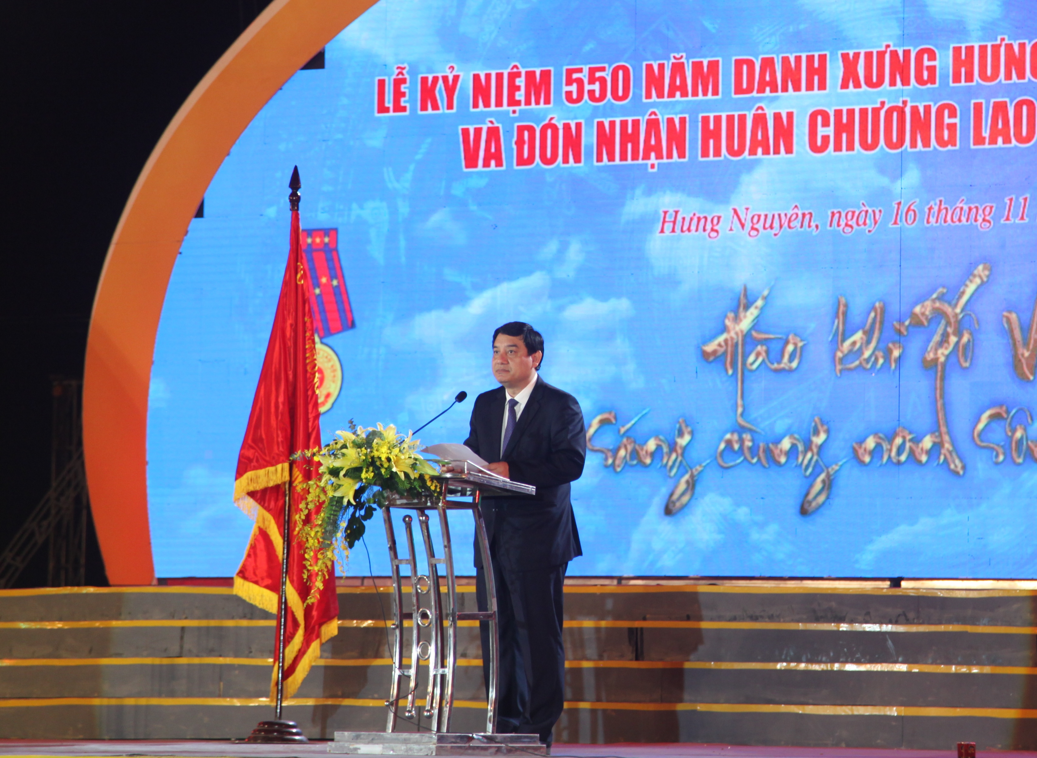 Tại diễn văn lễ kỷ niệm, ông Ngô Phú Hàn - Chủ tịch UBND huyện Hưng Nguyên khẳng định: Hưng Nguyên tự hào là quê hương đi tới nơi nào cũng in đậm dấu vết lịch sử với hơn 120 di tích, trong đó có 12 di tích đã được xếp hạng Quốc gia, 25 di tích xếp hạng cấp tỉnh và nhiều di tích đang lập hồ sơ đề nghị xếp hạng. Người dân Hưng Nguyên không tiếc mồ hôi, công sức khai sơn phá thạch, chế ngự thiên nhiên, cày bừa đất đai thành thuộc và không tiếc máu xương, của cải để bảo vệ quê hương, đất nước. Ngày hôm nay, với bản tính cần cù, nhân ái, người dân Hưng Nguyên đoàn kết một lòng, hòa hợp giữa các tôn giáo, sẻ chia với người nghèo, chung vai, góp sức cho mục tiêu xây dựng quê hương phát triển bền vững.