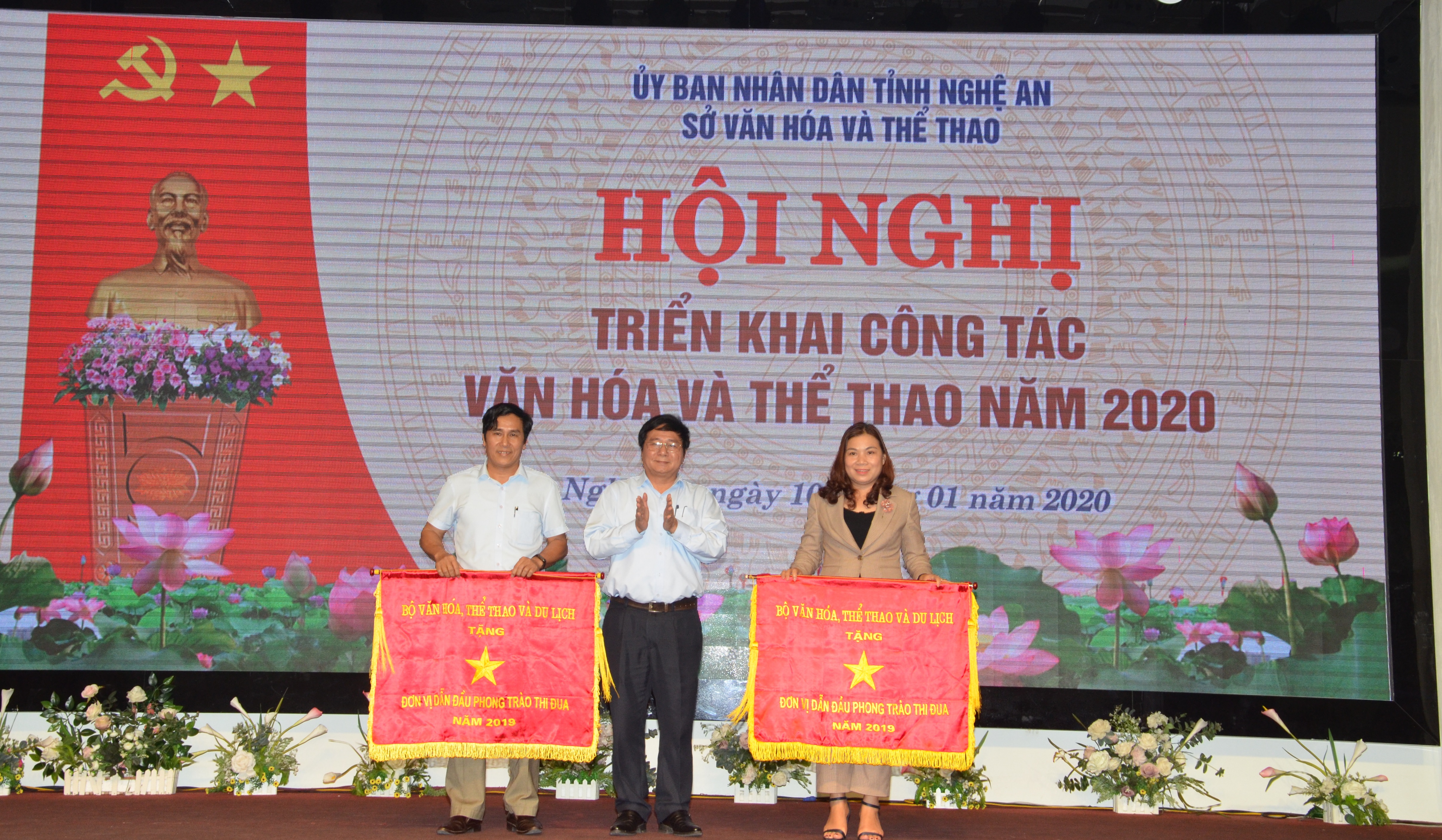 Ông Hồ Mậu Thanh - TUV, Giám đốc Sở VHTT trao Cờ thi đua xuất sắc của Bộ VH,TT&DL cho Phòng VHTT các huyện Đô Lương và Quỳ Hợp. Ảnh: Hoài Sơn