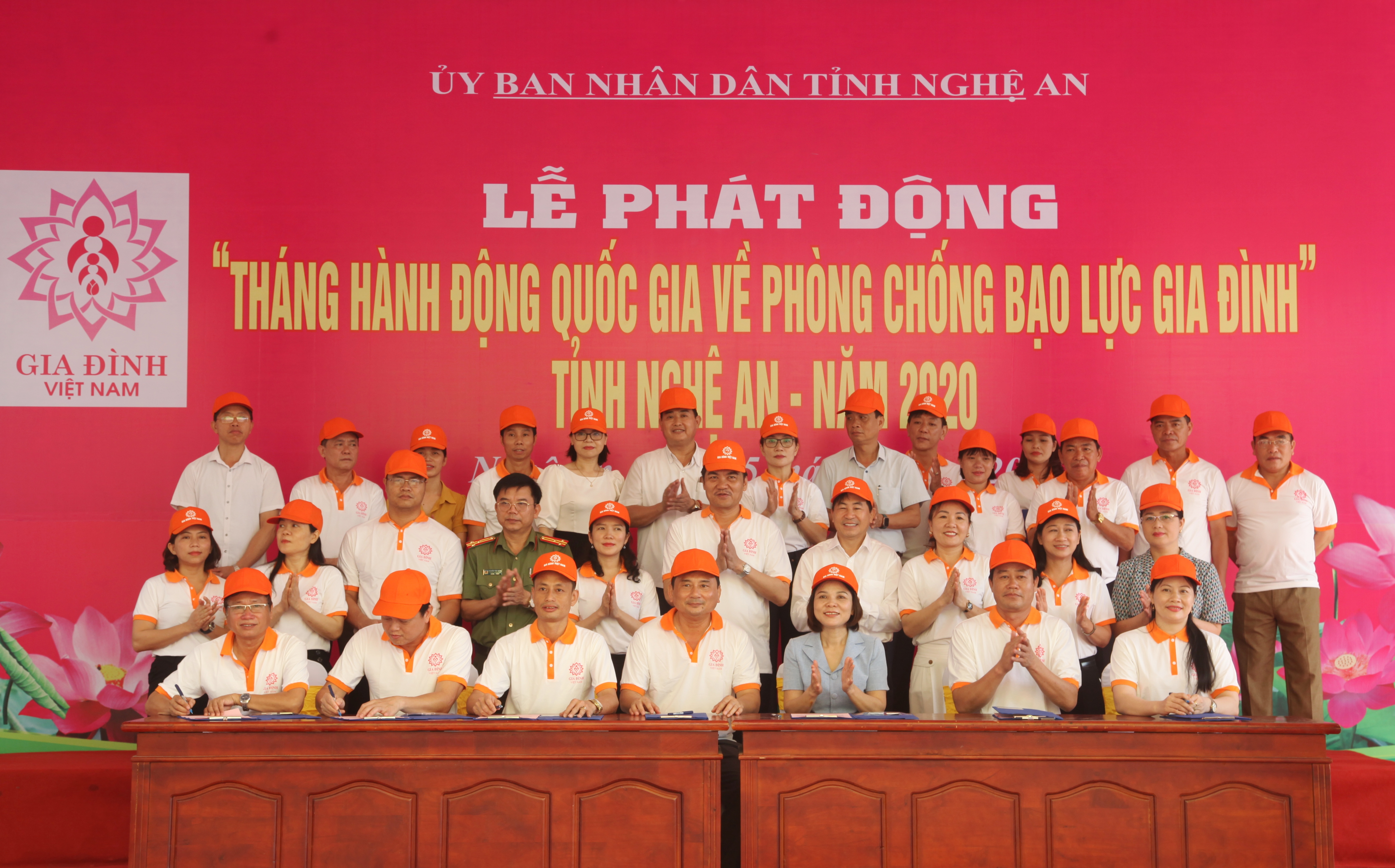 Tại buổi Lễ, đại điện lãnh đạo UBND 21 huyện, thành, thị đã ký cam kết thực hiện tháng hành động quốc gia về phòng, chống bạo lực gia đình tỉnh Nghệ An năm 2020.