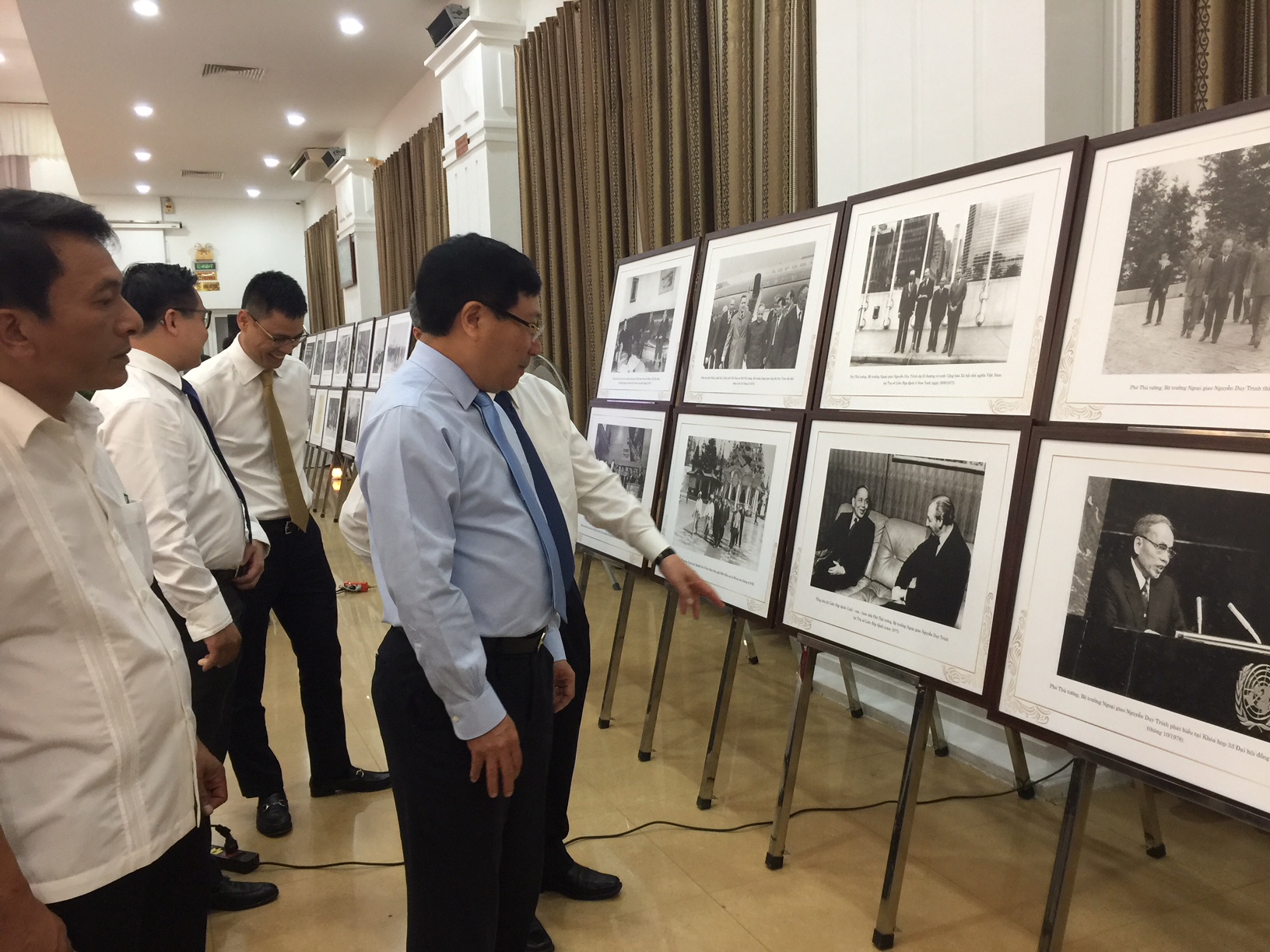 Các đại biểu xem trưng bày chuyên đề “Một số hình ảnh về cuộc đời và sự nghiệp cách mạng của đồng chí Nguyễn Duy Trinh”.