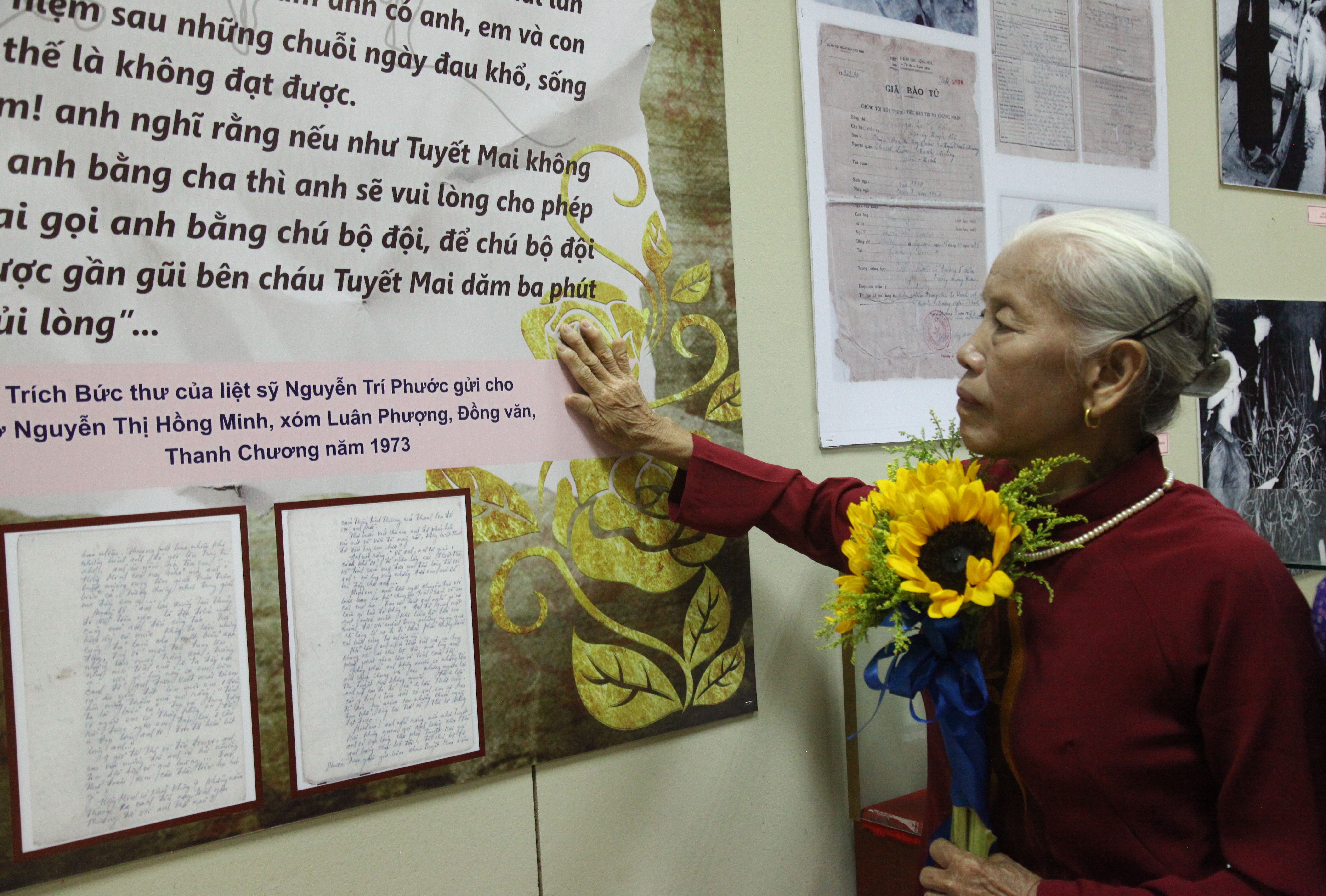 Bà Nguyễn Thị Hồng Minh bên bức thư của chồng (liệt sỹ Nguyễn Trí Phước) gửi cho bà năm 1973