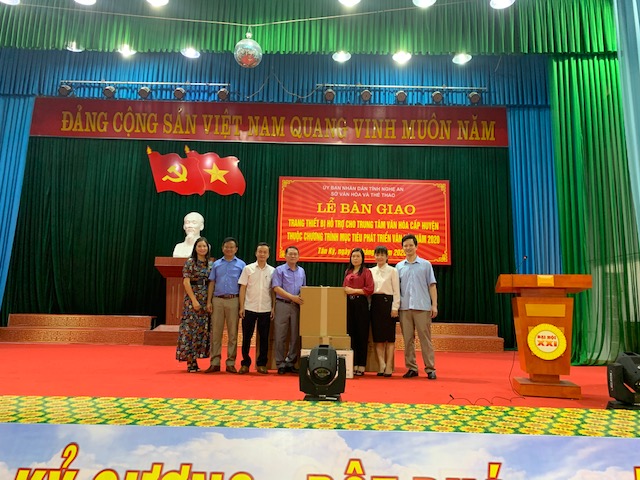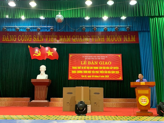 Ngày 30/9, Sở Văn hóa và Thể thao Nghệ An phối hợp với UBND huyện Tân Kỳ, tỉnh Nghệ An tổ chức lễ bàn giao trang thiết bị thuộc chương trình mục tiêu phát triển văn hóa năm 2020 cho Trung tâm Văn hóa, Thông tin và Truyền thông huyện Tân Kỳ.
