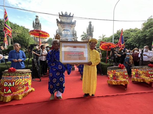 Đồng chí Trịnh Thị Thủy - Thứ trưởng Bộ Văn hóa, Thể thao và Du lịch trao Bằng xếp hạng Di tích lịch sử Quốc gia đặc biệt "lăng mộ và đền thờ Nguyễn Xí", Bằng xếp hạng Di tích lịch sử cấp Quốc gia "Địa điểm Cầu Cấm". Ảnh: Thành Duy