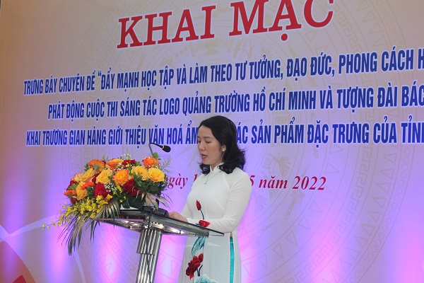 Phát biểu khai mạc, Giám đốc Sở VH&TT Nghệ An Trần Thị Mỹ Hạnh nêu rõ: Chủ tịch Hồ Chí Minh - Lãnh tụ thiên tài của Cách mạng Việt Nam, Anh hùng giải phóng dân tộc, danh nhân văn hóa kiệt xuất. Cuộc đời và sự nghiệp của Người đã trở thành biểu tượng thiêng liêng của phong trào đấu tranh giải phóng dân tộc, vì hòa bình, công lý và tiến bộ xã hội của nhân loại. Người không chỉ đem lại tự do cho dân tộc, cuộc sống ấm no, hạnh phúc cho Nhân dân mà còn để lại cho dân tộc Việt Nam và các thế hệ hôm nay và mai sau một di sản tinh thần vô cùng quý báu, đó là tư tưởng, đạo đức, phong cách Hồ Chí Minh. Học tập và làm theo tư tưởng, đạo đức và phong cách của Chủ tịch Hồ Chí Minh là việc làm rất thiết thực, là nhiệm vụ hết sức quan trọng, thường xuyên, không thể thiếu đối với toàn Đảng, toàn quân và toàn dân ta, mà truớc hết là các tổ chức đảng, các cơ quan Nhà nước, cán bộ, đảng viên trong tu dưỡng, rèn luyện, cống hiến, phụng sự đất nước, phục vụ Nhân dân.Nhận thức rõ ý nghĩa, tầm quan trọng của việc học tập và làm theo tư tưởng, đạo đức, phong cách Hồ Chí Minh, trong những năm qua,việc thực hiện Chỉ thị 05 của Bộ Chính trị đã đạt được nhiều kết quả quan trọng, toàn diện, với nhiều cách làm mới, sáng tạo, thiết thực, tạo chuyển biến mạnh mẽ, tích cực, có sức lan tỏa sâu rộng trong toàn Đảng và toàn xã hội, góp phần tạo ra những đột phá trong việc phát triển kinh tế - xã hội, xây dựng và bảo vệ đất nước…