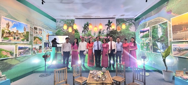Thứ trưởng Bộ VHTTDL Tạ Quang Đông thăm và chụp hình lưu niệm tại gian trưng bày tỉnh Nghệ An. Ảnh Thu Vân