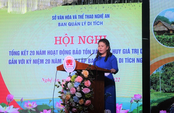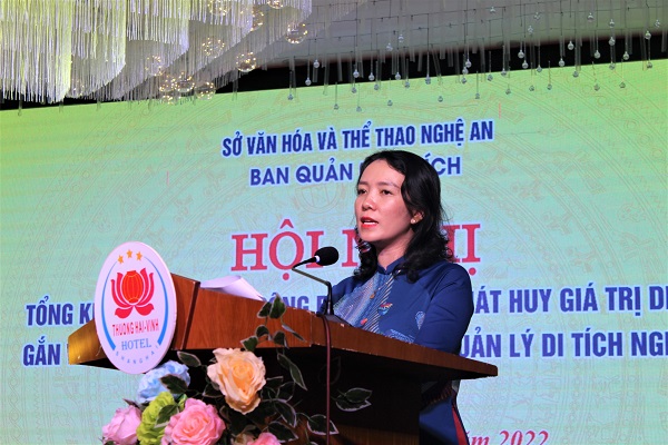 Bà Trần Thị Kim Phượng - Trưởng Ban quản lý Di tích tỉnh phát biểu tại Hội nghị. Ảnh Nam Phạm