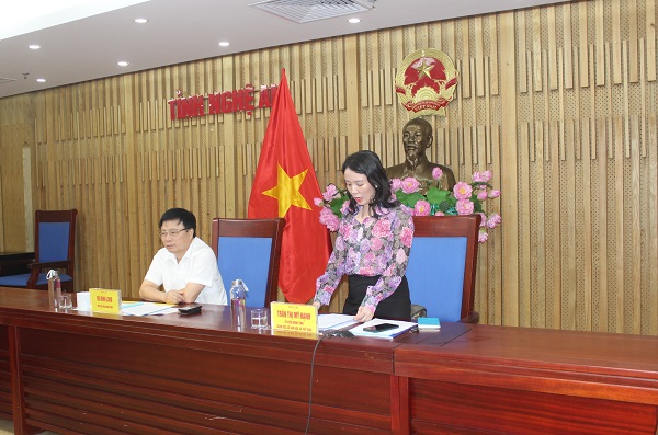 Phát biểu tại điểm cầu Nghệ An, đồng chí Trần Thị Mỹ Hạnh đã báo cáo “ Kết quả thực hiện chủ đề công tác năm của ngành Văn hoá, Thể thao và Du lịch với chủ đề “ Xây dựng môi trường Văn hoá cơ sở và công tác tổ chức cán bộ” trên địa bàn tỉnh Nghệ An”. Theo đó, 6 tháng đầu năm 2022, ngành Văn hóa và Thể thao Nghệ An đã hoàn thành tốt các nhiệm vụ được giao và đạt được những kết quả nổi bật như: Tổ chức các hoạt động truyền thông, tuyên truyền xây dựng môi trường văn hoá cơ sở; tích cực xây dựng mô hình, điển hình văn hoá tiêu biểu, tính đến nay đã có 191 mô hình văn hoá đượ công nhận tiêu biểu cấp tỉnh; Thành lập các câu lạc bộ di sản văn hoá phi vật thể; tham mưu Hội đồng Nhân dân tỉnh ban hành Nghị quyết hỗ trợ Nghệ sỹ, Nghệ sỹ nhân dân, các câu lạc bộ, mỗi câu lạc bộ thành lập được hỗ trợ 30 triệu đồng và duy trì hoạt động có kinh phí hỗ trợ (hiện nay Nghệ An có 124 Câu lạc bộ Dân ca Ví, Giặm, 60 CLB bảo tồn nghệ thuật trình diễn các dân tộc thiểu số).