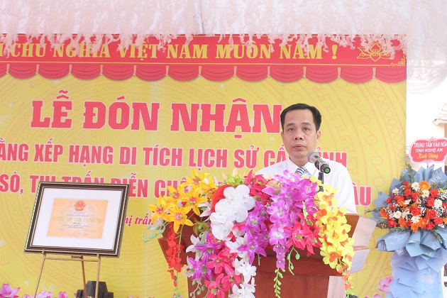 Phát biểu tại lễ đón nhận bằng di tích, đồng chí Bùi Công Vinh, Phó giám đốc Sở Văn hóa và Thể thao đã đánh gia cao những nỗ lực của chính quyền và Nhân dân huyện Diễn Châu trong việc bảo tồn, tôn tạo, phát huy giá trị di sản trên địa bàn trong thời gian qua. Đồng thời đề nghị Đảng bộ và nhân dân thị trấn Diễn Châu tiếp tục phát huy truyền thống văn hóa của địa phương để phát huy giá trị di tích đền Sò, biến nơi đây thành một trong những địa điểm văn hóa tâm linh hấp dẫn, thu hút du khách về với quê hương Diễn Châu.