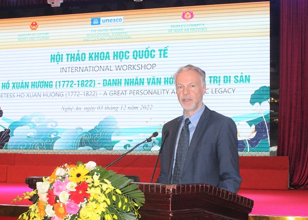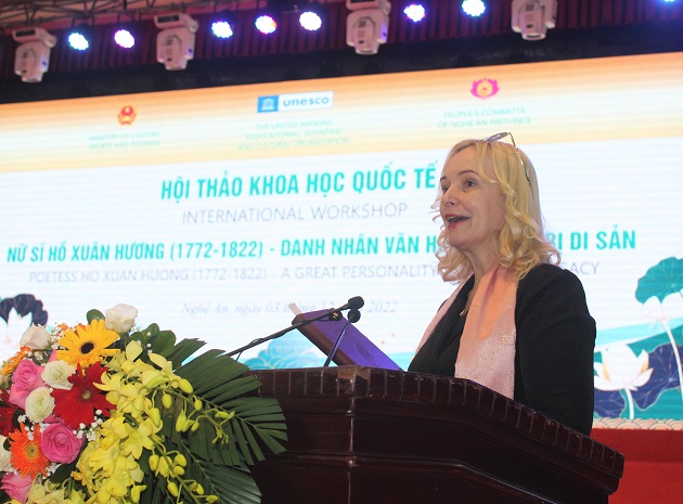 Phát biểu đề dẫn Hội thảo, đồng chí Nguyễn Đức Trung - Phó Bí thư Tỉnh ủy, Chủ tịch UBND tỉnh Nghệ An nêu rõ: Nghệ An vinh dự và tự hào là quê hương của hai danh nhân văn hóa đã được Tổ chức Giáo dục, Khoa học và Văn hóa của Liên hợp quốc (UNESCO) vinh danh, đó là Chủ tịch Hồ Chí Minh và Nữ sĩ Hồ Xuân Hương. Nghị quyết 41C/15 ngày 23 tháng 11 năm 2021 của Đại hội đồng UNESCO thống nhất vinh danh và cùng tham gia kỷ niệm 250 năm năm sinh của Nữ sĩ Hồ Xuân Hương (1772 - 1822) - “Bà chúa thơ Nôm” của Việt Nam đã khẳng định sự đánh giá cao của quốc tế đối với những giá trị về văn học nghệ thuật và đặc biệt là tư tưởng về bình đẳng giới, giải phóng phụ nữ của Nữ sĩ Hồ Xuân Hương, xứng tầm là một Danh nhân văn hóa mang tầm vóc nhân loại, nhà thơ mang tầm vóc một Thi hào. Cũng từ đây, Nữ sĩ Hồ Xuân Hương được UNESCO trao sứ mệnh vinh quang: sứ mệnh truyền cảm hứng và lan tỏa ảnh hưởng tích cực đến mọi người trên thế giới.