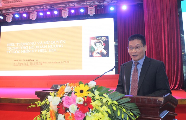 PGS.TS. Đinh Hồng Hải (Hiệp hội Ký hiệu học châu Á) tham luận tại Hội thảo. Ảnh: Hồ Hà