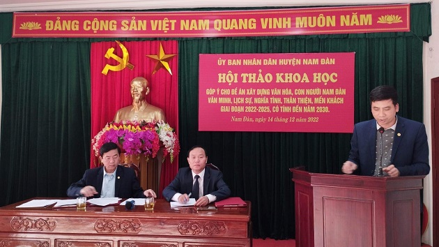Chiều ngày 14/12/2022, tại huyện Nam Đàn, UBND huyện Nam Đàn đã tổ chức Hội thảo khoa học góp ý cho Đề án "Xây dựng văn hóa, con người Nam Đàn văn minh, lịch sự, nghĩa tình, thân thiện, mến khách giai đoạn 2022 - 2025, có tính đến năm 2030" dưới sự chủ trì của ông Vương Hồng Thái - Phó Chủ tịch UBND huyện và ông Nguyễn Văn Đường - Trưởng phòng Văn hóa Thông tin huyện Nam Đàn.
