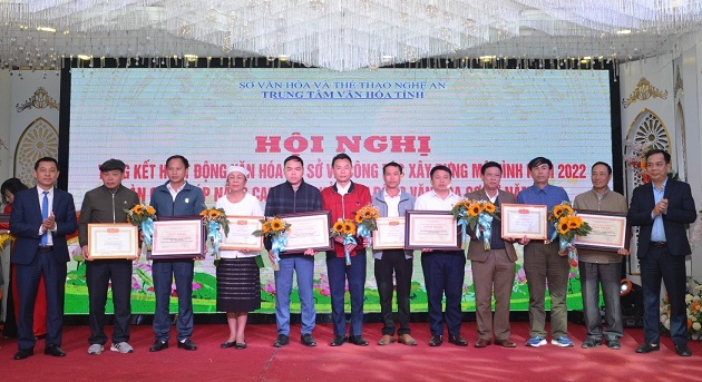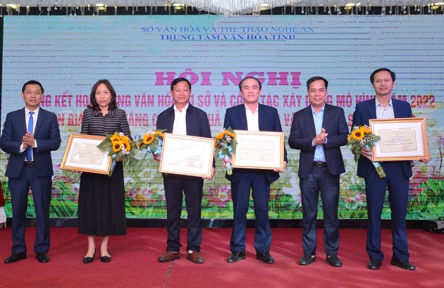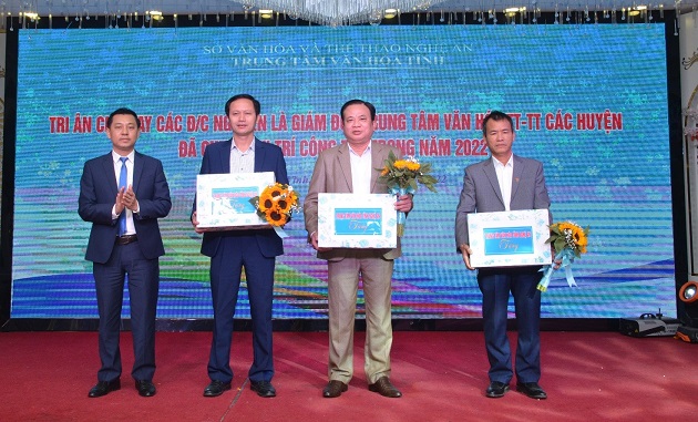Tại hội nghị, có 2 tập thể (Trung tâm VH,TT&TT các huyện Tân Kỳ và Yên Thành) và 2 cá nhân (ông Trần Hữu Giáp - Giám đốc Trung tâm VHTT&TT huyện Nam Đàn và bà Lô Thị Y Mai - Giám đốc Trung tâm VHTT&TT huyện Quế Phong) được nhận giấy khen của Cục Văn hóa cơ sở. 9 mô hình văn hóa cấp tỉnh được Sở VH&TT tặng giấy khen. Trung tâm Văn hóa tỉnh tặng quà cho các Giám đốc Trung tâm VH,TT&TT huyện chuyển công tác khác trong năm 2022.