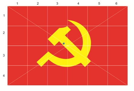 Biểu tượng “Búa - Liềm” (Đảng huy): “Búa” và “Liềm” đặt vuông góc với nhau (không có nét chồng tại chỗ giao nhau giữa “Búa” và “Liềm”. Đường kính của “Búa - Liềm” bằng 4/10 chiều ngang lá cờ; “Búa - Liềm” đặt ở trung tâm của lá cờ. Hình “Búa” đặt chếch lên 45 độ so với chiều ngang lá cờ; cán “Búa” và cán “Liềm” hình chữ nhật; mặt trên cùng đầu “Búa” tạo thành đường thẳng với đỉnh nhọn lưỡi “Liềm”; điểm giao nhau giữa cán “Búa” và đầu “Búa” tạo thành đường thẳng với mặt trên cán “Liềm”; điểm dưới cùng của cán “Búa” tạo thành đường thẳng ngang với điểm dưới cùng của cán “Liềm”.