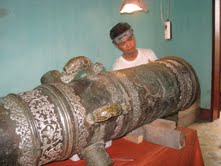 Khẩu súng thần công được phục hồi trên là khẩu số 2 trong số 3 khẩu thần công có tên gọi là Bảo quốc an dân Đại tướng quân được các ngư dân Hà Tĩnh phát hiện trên biển trong quá trình khai thác hải sản, các cơ quan chức năng thu hồi về Bảo tàng Hà Tĩnh vào năm 2003. Được biết, mỗi khẩu nặng 1,4 tấn, dài 2,43m, đường kính thân súng 40cm, đường kính nòng súng 22cm. Bao quanh thân súng trang trí nhiều dải hoa văn dát bạc. Phía đuôi súng có khắc chìm dòng chữ Hán “ Minh Mạng nhị niên tuế thứ Tân Tỵ cát nguyệt nhật chú, mệnh danh Bảo quốc an dân Đại tướng quân, tam vị chi nhị (chi nhất, chi tam). Nghĩa là súng được đúc vào ngày tháng tốt năm Tân Tỵ, Minh Mạng năm thứ hai (1821), có tên Bảo quốc an dân Đại tướng quân”. Phần cuối thân súng, cạnh biểu tượng hình quả tim có “bài minh văn” bằng chữ Hán khảm vàng. Tuy nhiên khi được thu hồi về bảo tàng tỉnh thì các họa tiết dát bạc và dát vàng đã hư hỏng và bị tháo gỡ.