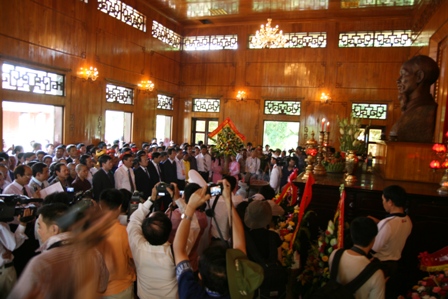 (VHNA):Lễ rước trong Lễ hội Làng Sen toàn quốc năm 2010 đã trang trọng diễn ra vào sáng nay (ngày 15/5/2010). Tham dự lễ có các ông Hoàng Tuấn Anh, Bộ trưởng Bộ Văn hoá, Thể thao và Du lịch; Trưởng Ban chỉ đạo; Trần Chiến Thắng, Thứ trưởng Bộ Văn hoá, Thể thao và Du lịch; Nguyễn Xuân Đường, Uỷ viên Ban Thường vụ Tỉnh uỷ Nghệ An, Trưởng Ban tổ chức; đại diện các cơ quan của bộ VH,TT & DL và các ban ngành trong tỉnh; 20 đoàn nghệ thuật quần chúng đến từ 20 tỉnh, thành; đông đảo nhân dân tỉnh nhà và đặc biệt là nhân dân huyện Nam Đàn. Sau khi dâng hoa tại tượng đài Bác Hồ (TP Vinh), đoàn rước đã khởi hành lên quê ngoại (làng Hoàng Trù, Kim Liên) và rước về Khu di tích Kim Liên (Làng Sen, Kim Liên, Nam Đàn). Tại lễ tưởng niệm ở Khu di tích Kim Liên, thay mặt cho Đảng bộ và nhân dân Nghệ An, ông Nguyễn Xuân Đường đã bày tỏ lòng nhớ thương và biết ơn sâu sắc của đồng bào Nghệ An đối với Bác và thưa rằng, thực hiện di chúc của Người, Nghệ An đã nỗ lực vượt qua khủng hoảng kinh tế và giữ được sự phát triển bền vững. Trong lĩnh vực văn hoá có nhiều cố gắng đáng ghi nhận. Đời sống văn hoá cơ sở ngày một nâng cao; công tác bảo tồn và phát huy di sản được chú trọng, hoạt động nghệ thuật quần chúng và nghệ thuật chuyên nghiệp ngày càng có chiều sâu; phong trào thể dục thể thao quần chúng phát triển sâu rộng, thể thao thành tích cao luôn giữ được truyền thống; hoạt động du lịch không ngừng tăng trưởng và mở rộng. Xin hứa với Bác, Nghệ An không ngừng phấn đấu để đạt và vượt mức các chỉ tiêu kế hoạch năm 2010; cố gắng để trở thành một tỉnh mẫu mực như Bác hằng mong muốn.Thuý Hoa