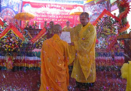 (VHNA): Lễ bổ nhiệm sư trụ trì chùa Lô Sơn và công bố quyết định chấp thuận phục hồi chùa Lô Sơn (của UBND tỉnh) đã diễn ra sáng ngày 25/5/2010 tại phường Nghi Tân, thị xã Cửa Lò. Tới dự có Đại đức Thích Minh Trí - Ủy viên Hội đồng trị sự TW Giáo hội Phật giáo Việt Nam, Chánh Văn phòng Hội Phật giáo Hà Nội, phụ trách Hội Phật giáo Nghệ An, trụ trì chùa Ân Hậu; Đại đức Thích Viên Như - Phó Ban trị sự, phụ trách Phật giáo Hà Tĩnh; đại diện Ban Tuyên giáo Tỉnh ủy, UBND, UBMT Tổ quốc tỉnh, lãnh đạo thị xã Cửa Lò, phường Nghi Tân cùng đông đảo các tăng ni, phật tử trong và ngoài tỉnh.