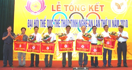 (VHNA): Ngày 1/7/2010, Sở VH,TT&DL Nghệ An đã tổ chức tổng kết Đại hội TDTT tỉnh Nghệ An lần thứ VI – 2010. Tại buổi lễ, Ban chỉ đạo và Ban tổ chức đã đánh giá cao và biểu dương những nỗ lực của chính quyền các cấp huyện, xã, các ngành, các nhà tài trợ và trường ĐH Vinh trong việc tổ chức Đại hội TDTT từ cấp cơ sở đến cấp huyện, các ban ngành và cấp tỉnh. Từ tháng 3 - 30/5/2010 có 470/478 xã, phường, thị trấn, 20/20 huyện, thành, thị và 3 ngành tổ chức Đại hội TDTT thành công tốt đẹp.Đại hội TDTT tỉnh Nghệ An lần thứ VI được tổ chức thành 2 giai đoạn: giai đoạn 1 từ 9/3 – 27/4/2010 với 9 môn thi đấu được tổ chức ở các địa phương trong tỉnh. Giai đoạn 2 từ 27/6 – 1/7/2010 với 8 môn được tổ chức tại thành phố Vinh.