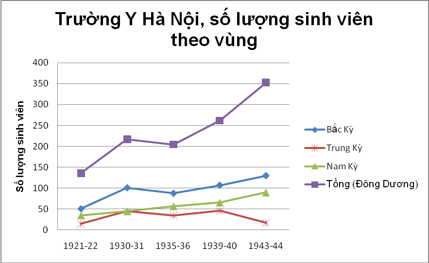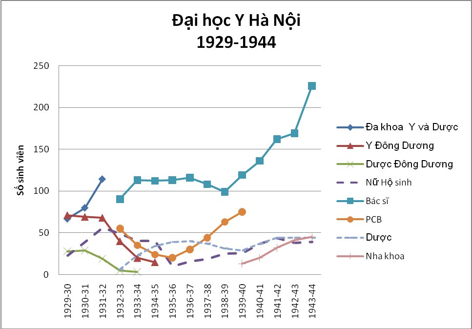 Hình 2 cho thấy sự thay đổi cơ cấu của trường Y Đông Dương trong khoảng thời gian từ 1929 đến 1944. Những năm 1932-1935 đánh dấu giai đoạn mới trong sự phát triển của nhà trường. Khoa Y học và Dược học Đông Dương bị xoá bỏ (1934 and 1935). Khoa Y học và Dược học đại cương phát triển thành các khoa đào tạo bác sĩ và dược sĩ. Những khoa này được công nhận là khoa trực thuộc trường Y Paris. Trong vòng 5 năm (1939-1944) số người đăng ký nhập học tăng hai lần, đạt hơn 200 sinh viên vào năm học 1944-1945.