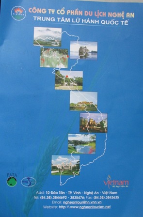 Tại Công ty Cp du lịch Nghệ An [Địa chỉ: Số 10 Đào Tấn – Vinh – Nghệ An] đang sử dụng, lưu hành Kẹp File in màu xanh, 04 mặt để giới thiệu, quảng cáo các tour du lịch trong nước và quốc tế. Ngay trang bìa đầu tiên, bên dưới dòng chữ “Công ty Cp du lịch Nghệ An – Trung tâm lữ hành quốc tế” là hình bản đồ Việt Nam có đánh dấu các điểm du lịch lớn trong cả nước nhưng không có hai quần đảo Hoàng sa và Trường Sa của Việt Nam. Ở trang cuối cũng vậy, bên dưới hàng chữ “ Bản đồ các tuyến du lịch quốc tế - nội địa xuất phát từ Vinh” (Song ngữ Anh – Việt) là hình bản đồ Việt Nam, Trung Quốc, Myanmar, Lào, Thái Lan. Điều đáng nói là ở khu vực Biển Đông, có đảo Hải Nam của Trung Quốc, nhưng không có các quần đảo Hoàng Sa và Trường Sa của Việt Nam.