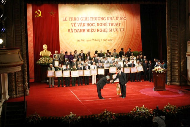 Viết đến đây, tôi không thể không dẫn ra bức ảnh về tư thế của ông Tiễn sĩ, Kiến trúc sư NTT, người được trao giải thưởng nhà nước về văn học nghệ thuật của Việt Nam cũng năm 2012 vừa qua. Đây là hình ảnh ông đứng trước Chủ tịch nước Trương Tấn Sang mà báo chí ta đã đưa tin .